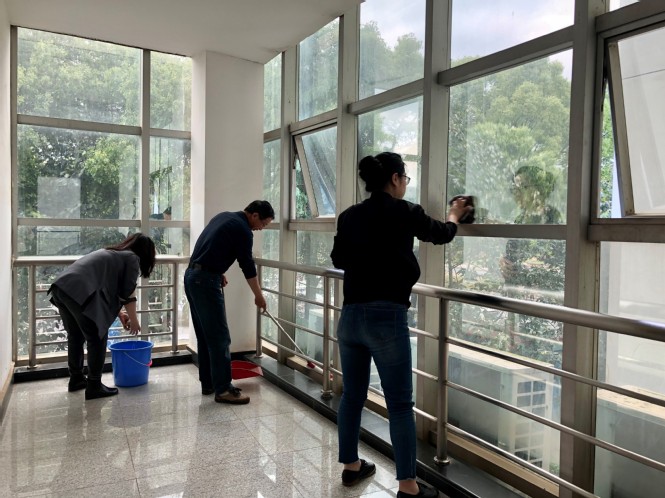 活动中,全体党员发扬志愿服务精神,撸起袖子,弯下身子,拿起扫帚和抹布,对校行政办公楼走廊上的玻璃窗、统战部会议室进行了清理,对卫生死角进行了除尘打扫。经过大家的齐心协力,校行政办公楼办公环境焕然一新。