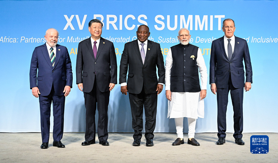 当地时间8月23日上午,金砖国家领导人第十五次会晤在约翰内斯堡杉藤会议中心举行。南非总统拉马福萨主持会晤。中国国家主席习近平、巴西总统卢拉、印度总理莫迪和俄罗斯总统普京(线上)出席。这是会晤期间,五国领导人集体合影。新华社记者 李学仁 摄