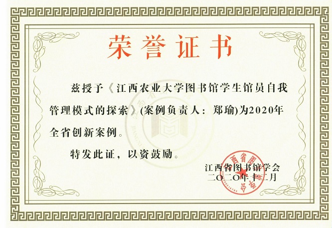 持续推进,品牌创建有成效。图书馆党支部高质量地开展“至臻服务”党建品牌创建活动以来,各项工作全面进步,自新馆启用至今,已有10余所高校图书馆领导及同仁前来调研学习我馆的管理模式和经验做法;工作成效全面提升,《欧冠官方网站图书馆学生馆员自我管理模式的探索》被评为2020年江西省创新案例,图书馆还获得2020年江西高校图书馆联盟文献传递先进单位、参考咨询工作先进单位荣誉称号;服务质量全面提高,为读者提供了个性化、多样化的服务,获得了读者广泛好评,也让广大读者的获得感和满意度进一步提升。