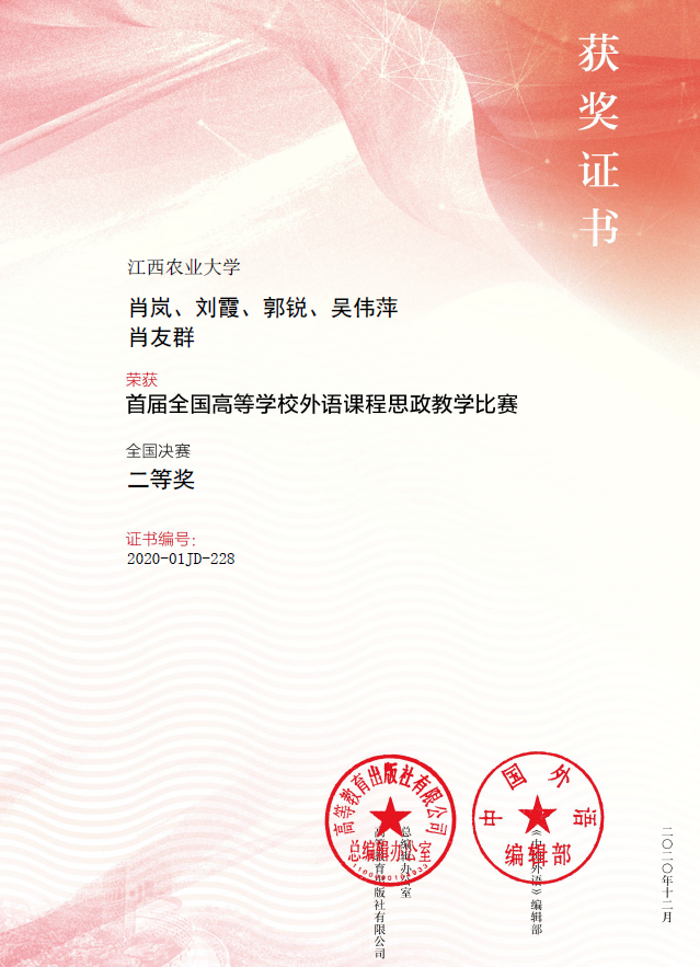 “全国高等学校外语课程思政教学比赛”共吸引来自29个省市、771所高校的1500个教学团队或个人参加,欧冠青年教师团队凭借过硬的教学能力,顺利进入全国决赛并喜获全国二等奖。