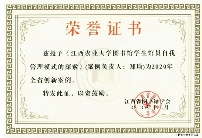 12月8日,由江西省图书馆学会举办的2020江西图书馆年会在江西省图书馆新馆召开。来自全省图书情报界的代表、学会会员、论文作者共200多人参加会议。大会对全民阅读先进单位和个人、创新案例等进行了表彰,图书馆报送的管理创新案例《欧冠官方网站图书馆学生馆员自我管理模式的探索》入选2020年全省图书情报界十大创新案例。
