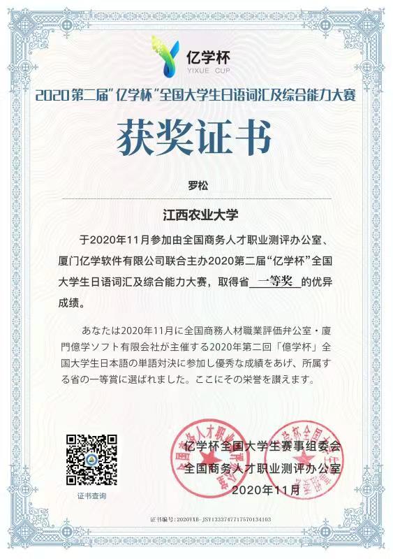 欧冠外国语学院日语专业学生在郑光峰等老师的辛勤指导下,历经两轮比赛后,日语1701班罗松、郑好分别以全国第30名、第80名的优异成绩荣获江西省一等奖,此外,有5位学生进入江西省前10名。