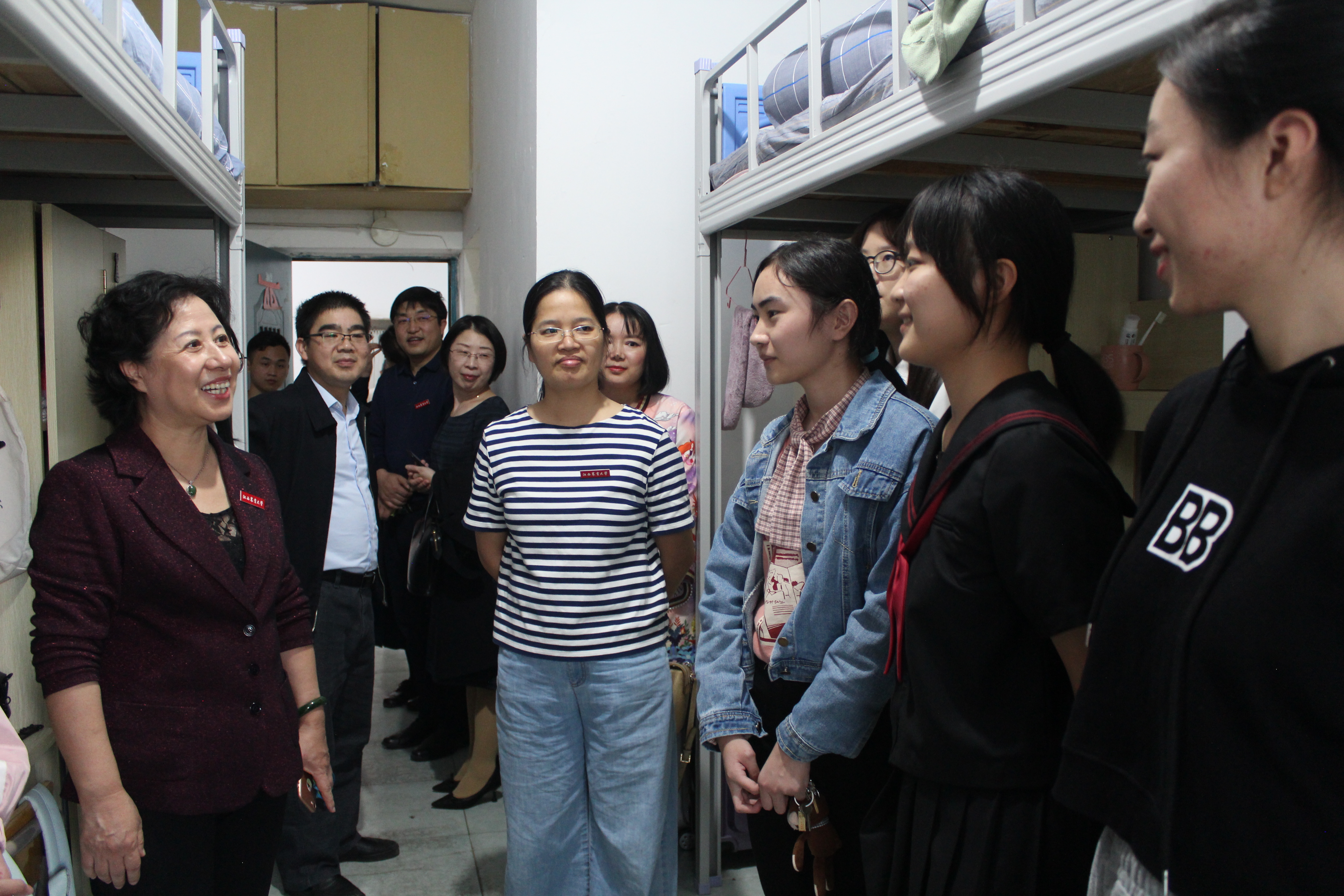 在学生宿舍,乔金霞认真查看了寝室里面的基本生活设施,与2020级新生面对面亲切交流,对新同学的到来表示热烈的欢迎,细声询问同学们的生活习惯、来自哪里、是否还适应这里的天气等等,温暖的话语让刚刚离家的新生们立刻感受到了家的温暖。在认真倾听新生对学校的第一印象与期待后,她进一步勉励同学们,一是要切实珍惜大学的学习时光,树立成才目标,提前做好四年的学习规划,努力做到学有所成;二是要在各方面严格要求自己,以饱满积极的态度开启大学生活,扎实学好专业知识,不辜负学校和父母的期望;三是要养成文明卫生的生活习惯,生活上要相互关照,学习上要相互督促,共同创造和维护良好的学习生活环境。