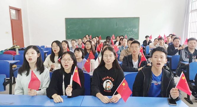 “我和我的祖国,一刻也不能分割,无论我走到哪里,都流出一首赞歌……”E教教学楼,响起了同学们激昂的歌声,同学们挥动着手中的小红旗,齐唱《我和我的祖国》,唱出爱国报国的拳拳之心,在一片五星红旗的海洋中,大家的心与祖国紧紧融合在一起。