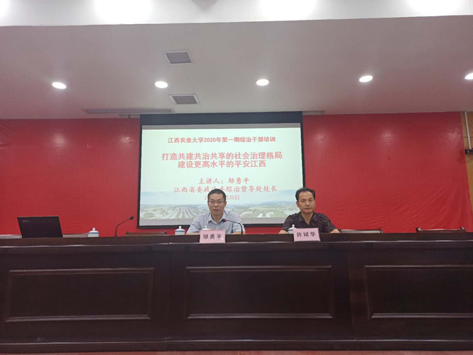 9月25日上午,学校邀请省委政法委综治督导处处长邹勇平在一楼报告厅为全校综治干部开展主题为《打造共建共治共享的社会治理格局 建设更高水平的平安江西》专题讲座,讲座由副校长许斌华主持,各单位综治工作主管、分管领导、兼职综治干部以及各学院平安志愿者参加。