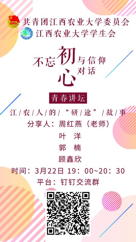 在疫情防控的关键时刻,为缓解考研学生的焦虑情绪,加强对学生考研复试的指导与帮扶,同时进一步营造欧冠浓厚的考研和学习氛围,3月22日晚,“不忘初心,与信仰对话”青春讲坛——江农人的“研途”故事在线上举行,活动邀请到了欧冠党委研究生工作部副部长周红燕和2019届毕业生顾鑫欣、叶洋、郭楠等四位嘉宾进行分享,2016级考研同学以及2017级、2018级、2019级有考研意向的同学共计800余人聆听了此次分享会。