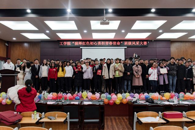 传承红色、铭记历史,不忘初心、勇担使命。12月6日,工学院在大学生活动中心501举办“演绎红色初心,勇担青春使命”班级风采大赛,学院5个专业的班级纷纷组队集体演绎爱国情怀。工学院党委书记张高亮、学工办老师与200余名同学一起观看了比赛。
