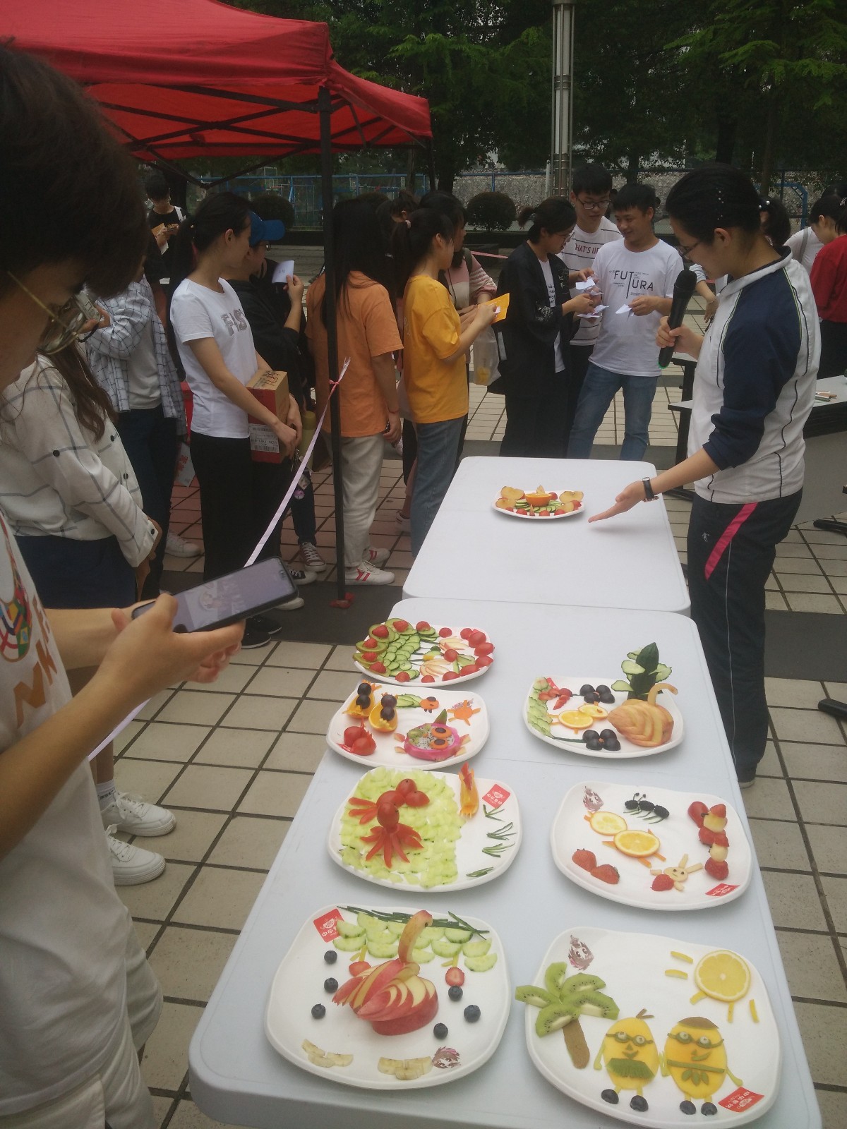 在果蔬拼盘大赛环节,经过初赛筛选进入决赛的6组选手在30分钟内将准备好的果蔬进行创意拼盘展示,并对寓意及营养搭配进行讲解,由活动现场随机60名观众投票决定名次。在选手紧张拼盘过程中进行了营养知识有奖竞答环节,观众积极参与其中,共发出60余组奖品,将比赛推向高潮。
