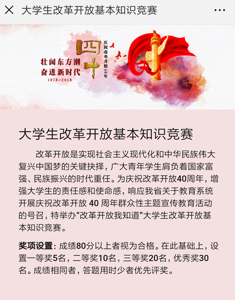 为庆祝改革开放40周年,增强大学生的责任感和使命感,响应我省关于教育系统开展庆祝改革开放 40 周年群众性主题宣传教育活动的号召,学工部(处)于2018年11月19日至11月30日举办了“改革开放我知道”大学生改革开放基本知识竞赛活动,本次比赛活动采取网络答题的方式进行,共有15643人参加。比赛评出一等奖5名,二等奖10名,三等奖20名,优秀奖30名。(文:学工部李向楠 编审:杨峰)