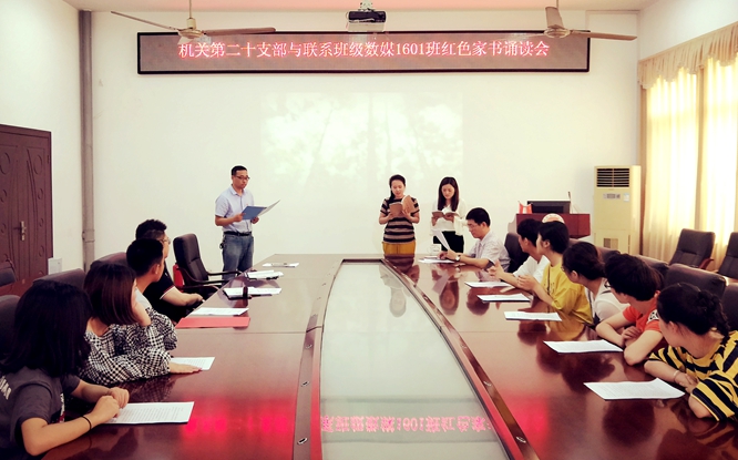 为传承红色基因、凝聚红色力量,积极响应省委书记、省长刘奇关于“每位同志都要认真读一读红色家书”的号召,6月1日,机关第二十支部与联系班级数媒1601班在大学生活动中心开展了诵读红色家书活动。