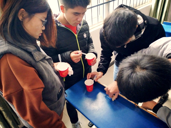 同学们发挥专业优势,成立清除剂研制组,在班主任的指导下,成功配制笔迹清除剂。同学们分成若干小组,对先骕楼四楼南面桌面上的涂鸦进行针对性的清除。经过同学们近3小时的努力,课桌椅上的字迹已基本清除干净,课桌恢复了光彩。