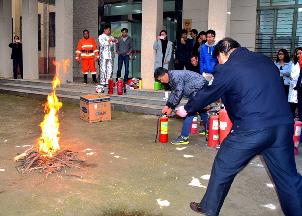 在火场逃生演练活动中,保卫处消防科张红云、韦玮、徐杰、熊林雨等先为师生讲解灭火器的使用方法、火场逃生自救注意事项和方法、自救器材的使用等基本知识,并现场示范了消防水带操作。在保卫处专业人员的指导下,师生们体验了如何正确使用灭火器。火场逃生演练是模拟学生在实验室上课时突发大火,逃生警报响起,学生迅速做好防烟尘准备,在引导员的指引下,从二楼东、南两个通道,沿墙壁有序撤离。