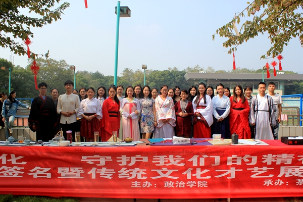 文化兴国运兴,文化强民族强。10月22日,在党的十九大胜利召开的喜庆氛围里,政治学院以“亲近中华优秀传统文化,守护我们的精神家园”为主题,在校园北区大学生活动中心室外举办了弘扬优秀传统文化签名暨传统文化才艺展示活动。此次活动由政治学院硕士生导师赵美岚老师创意策划,政治学院全体研究生组织参与,并在欧冠官方网站大学生茶艺社、墨韵书法协会倾情协助下顺利开展。