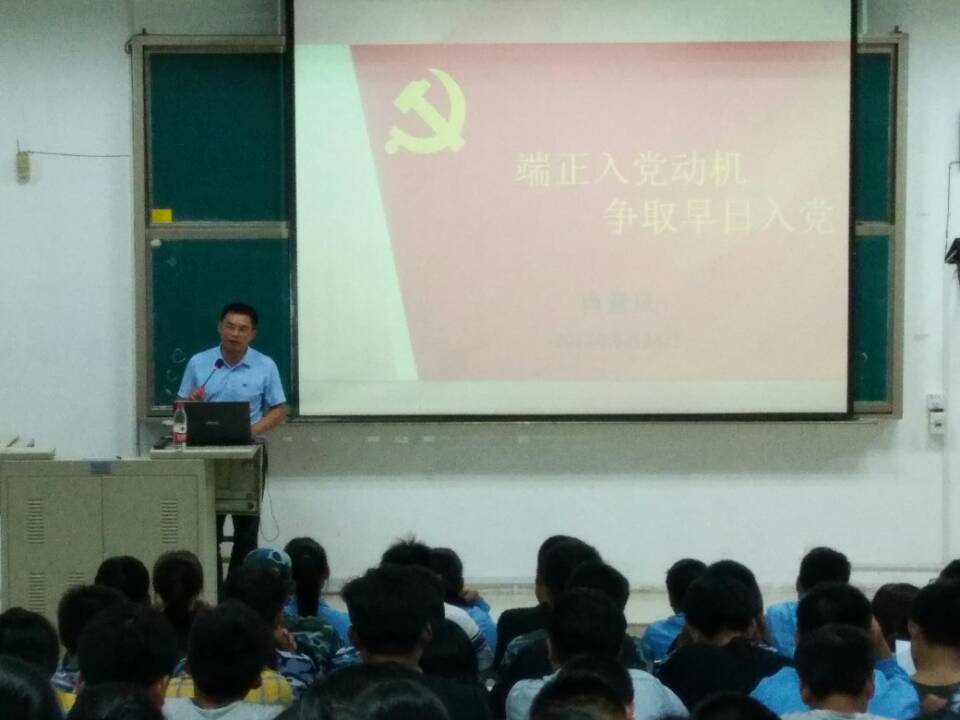 9月28日晚上,农学院党委副书记肖意风先后在名达楼208、308教室为2017级新生上《端正入党动机,争取早日入党》专题党课。课程中,肖意风向新生普及党的基本知识,详细阐述大学生入党的规定和党员发展的具体流程,并就“什么是入党动机”、“不良入党动机的主要表现形式及产生因素”、“何为正确的入党动机”、“如何端正入党动机”等方面进行详细分析。他寄语新生要认真学习政治理论,自觉加强党性修养,锤炼意志品格,主动接受党组织的培养教育和考察,争取早日入党。