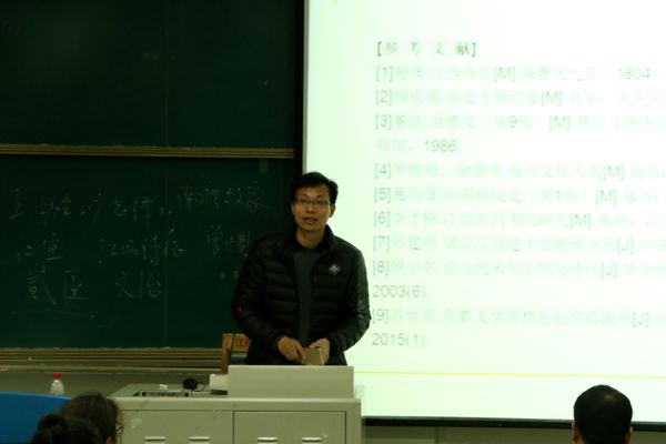 明初江右诗坛诗歌繁荣、诗人众多,但在地理的分布上,却存在着明显的不平衡性,并显示出鲜明的区域特征。温老师从地理经济、人文积淀、教育情形等方面向同学们解释了其原因,并指出江右诗人的创作具有地域趋同性即“雅正风尚”。