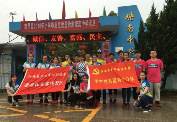 7月3日,外国语学院暑期“三下乡”大学生志愿者服务营队前往南昌县塘南镇,进行为期十天的“外语助力十三五,情暖塘南下乡路”义务支教活动。由25名外国语学院的党员、团员及优秀学生干部组成的营队,将针对一年级到六年级的小学生进行十天的义务支教。