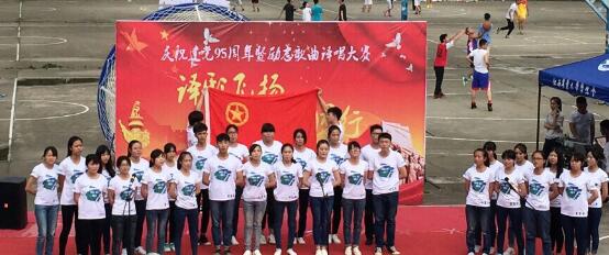 今年是中国共产党95岁华诞,为大力弘扬爱国主义精神,讴歌中华民族实现伟大复兴中国梦的奋斗历程,结合“两学一做”学习教育精神,6月4日,外国语学院团委在学校南区篮球场举办了“译彩飞扬,语梦同行”庆祝建党95周年励志歌曲译唱大赛。来自外国语学院的16个团支部,500余名大学生参与了此次大赛。学院英语专业的老师及团委指导老师莅临现场,并担任比赛评委及颁奖嘉宾。
