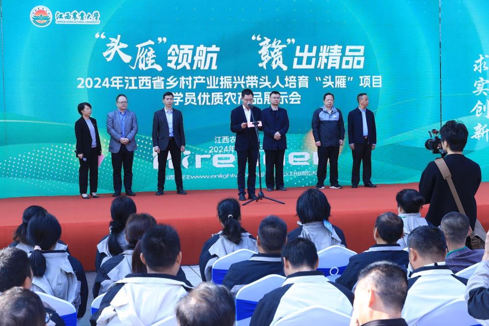为进一步提升“头雁”学员的联农带农能力,促进农业产业增收与乡村振兴,11月2日上午,学校在大学生文化广场举办“头雁”学员优质农产品展示活动。副校长王文君、江西省农业农村厅人事处副处长雷力、江西省农业农村产业发展服务中心乡村人才与文化促进处处长蒋伍平、校友工作服务中心、工会负责人、继续教育学院负责人、历届“头雁”和高素质农民学员参加了启动仪式。