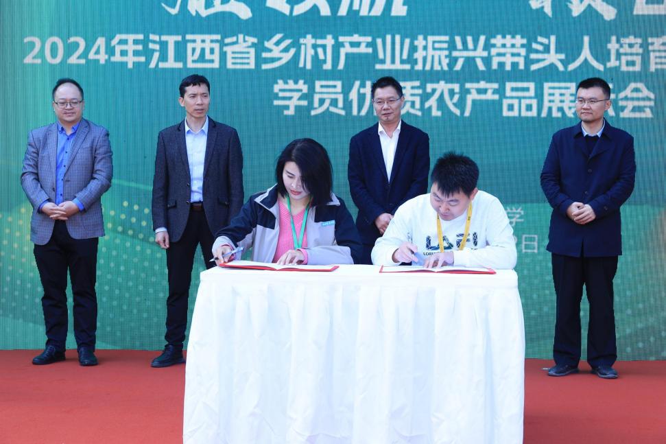 活动中,参会领导共同开启了头雁”学员优质农产品展示会的启动按钮,见证了南昌幽美农业发展有限公司负责人、“头雁”学员熊美琴与江西美团优选合作签约仪式。学校积极为“头雁”学员牵线搭桥,促成与头部供应链平台合作,助力乡村振兴。