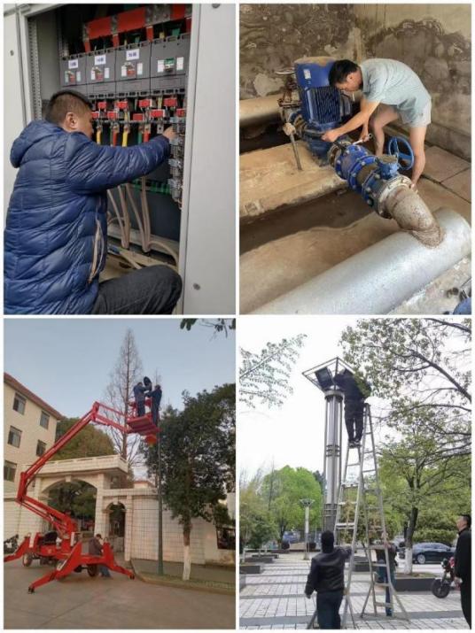 集团始终将水电及时维修、高效维修放在首位,尽最大努力将影响和损失降到最低。针对金桂苑住宅小区高楼层居民反映“水流不大、水压不够”的问题,集团组织人员深夜进行测漏,“把脉问诊”,找出症结,“对症下药”,连夜加班抢修,为学校节约水资源数万吨的同时,尽最大努力解决居民用水“后顾之忧”。近三年,集团共完成水电紧急抢修任务76起,完成日常维修600余件,完成水电设备维护80余台次,对校园内部分亮度不够区域加装路灯136盏,及时维修路灯500余盏次,使得校园夜间照明亮度有了明显提升。