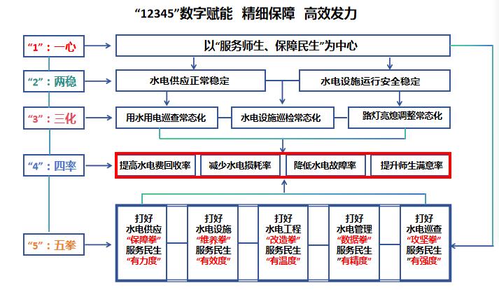 近年来,后勤服务集团秉承“全心全意为广大师生服务”的理念,倾力打造“12345”工作法(一心、两稳、三化、四率、五拳),即以“服务师生、保障民生”为中心,确保“水电供应正常稳定、水电 设施运行安全稳定”,坚持“用水用电巡查常态化、水电设施巡检常态化、路灯亮熄调整常态化”,致力“提高水电费回收率、减少水电损耗率、降低水电故障率、提升师生满意率”,用心打好水电供应“保障拳”、水电设施“维养拳”、水电工程“改造拳”、水电管理“数据拳”、水电巡查“攻坚拳”,从多维度赋能水电高质量服务师生、保障民生。