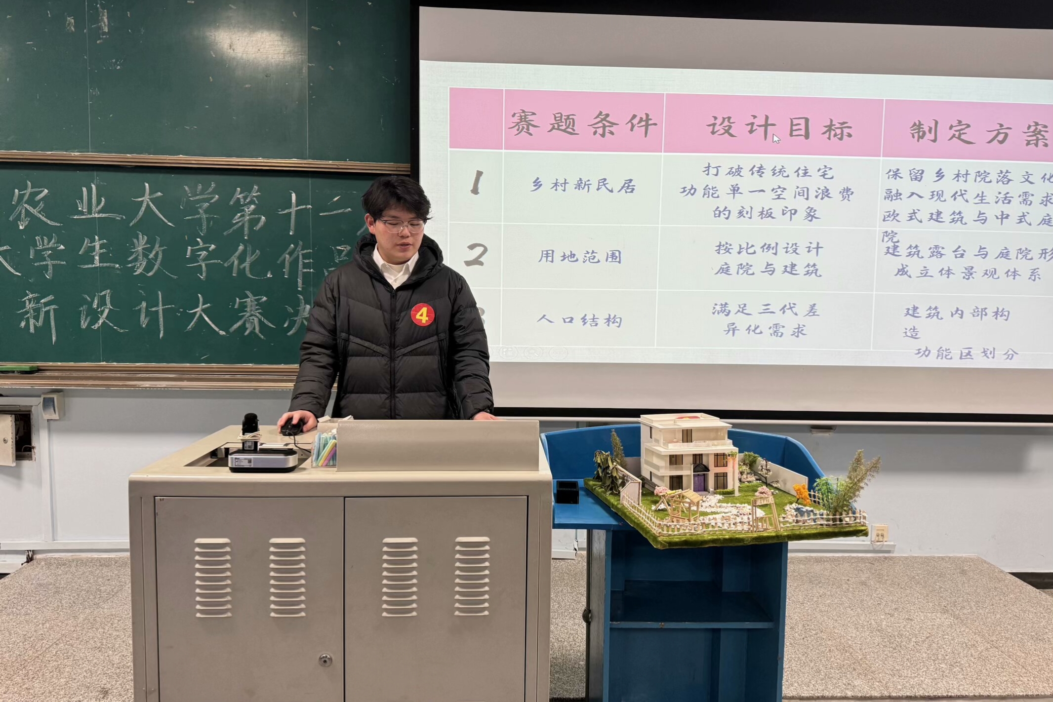决赛现场,各参赛队伍通过方案设计、现场答辩及实操竞技等环节,全方位展示作品的创意设计与技术实力。评审专家从技术创新性、方案可行性、应用价值及答辩表现等方面进行严格评审。最终,农业工程22级研究生谢琪翔负责的“基于自主导航的丘陵山地果园立式螺旋开沟施肥覆土机”和农机2201王 波申负责的“一种高效率利用风压的小粒径精量排种装置”荣获创新设计类特等奖,环设2301邹祖伦负责的“四水·归堂”和水利2401段子琳负责的“乡村新民居的设计与制作”荣获造型设计类一等奖。