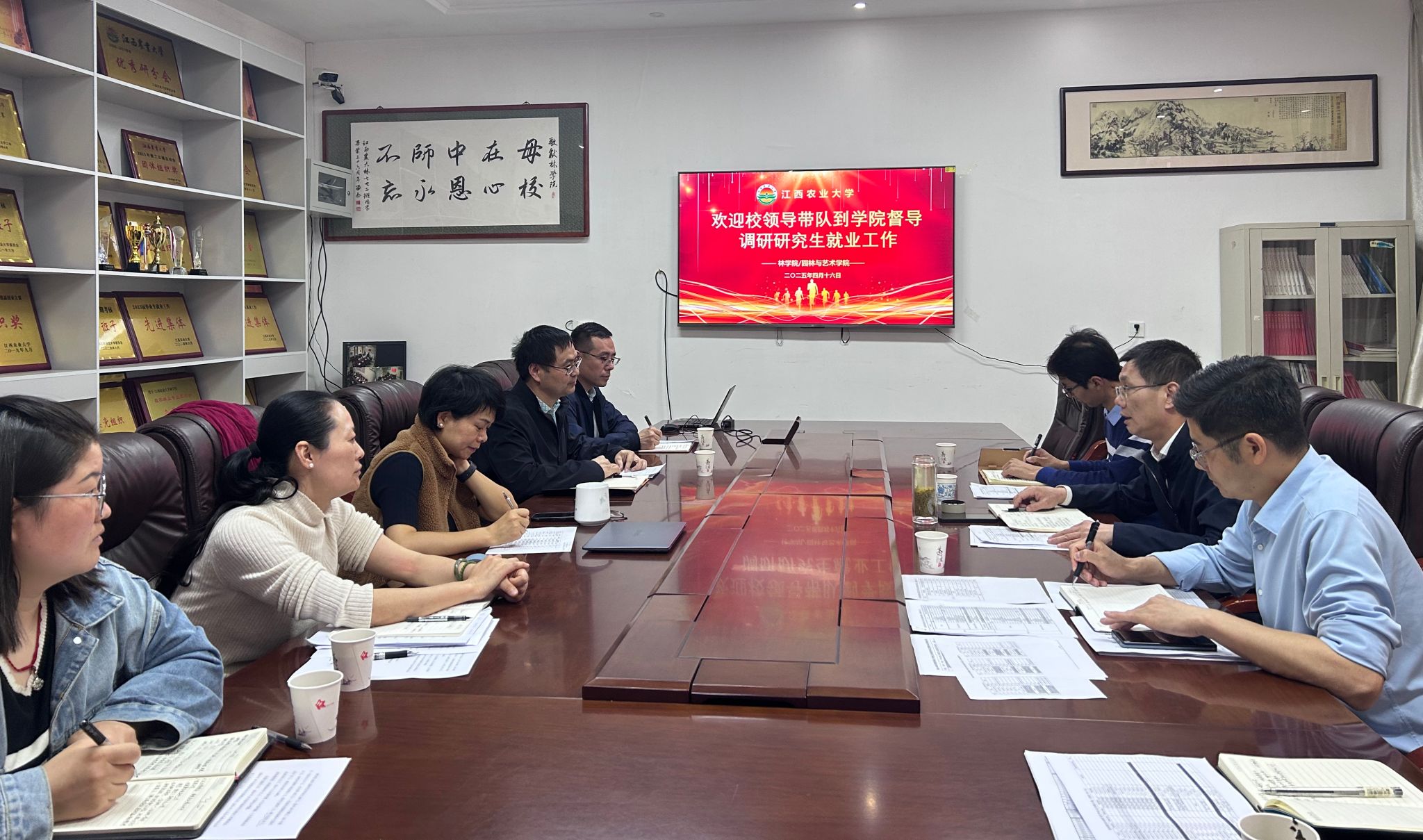 4月16日至21日,副校长王文君带队深入食品科学与工程学院、动物科学技术学院、林学院(园林与艺术学院)、人文与公共管理学院,调研督导2025届毕业研究生就业工作。党委研工部负责人陪同调研督导。