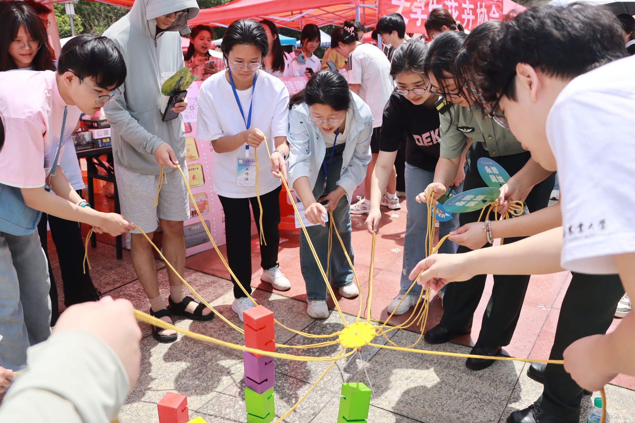 创意市集 社彩纷呈。各学生社团通过现场表演、互动体验、模拟操作等形式,全方位展示社团特色。手工艺品制作、心理桌游、数字化设计作品展览、摄影基础教学、茶艺表演、趣味点歌、政策宣讲、素质拓展等活动精彩纷呈;非遗体验区更是吸引众多学生驻足,非遗漆扇、手工簪花、汉服拍照等特色活动,让同学们近距离感受非遗文化的博大精深,感受传统文化的独特魅力。