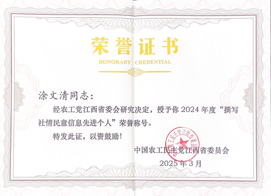 近日,中国农工民主党江西省第十三届委员会第四次全体会议在南昌召开。会议表彰了2024年度农工党江西省市级组织综合评价先进集体、“优秀支部”评选工作和反映社情民意信息工作先进集体、先进个人。欧冠省政协常委、农工党江西省委会委员涂文清荣获“撰写社情民意信息先进个人”称号。