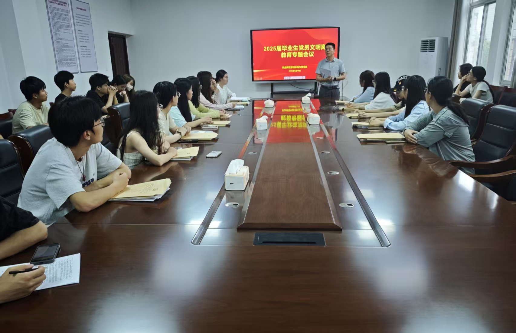 为强化毕业生理想信念教育,引导毕业生厚植家国情怀、铭记责任担当,近期,职业师范学院组织2025届毕业生以班级为单位开展“爱校荣校”专题教育活动,组织毕业生党员开展专题离校教育活动。学院党政领导班子、毕业班班主任、学工干部及全体毕业生党员共同参与。