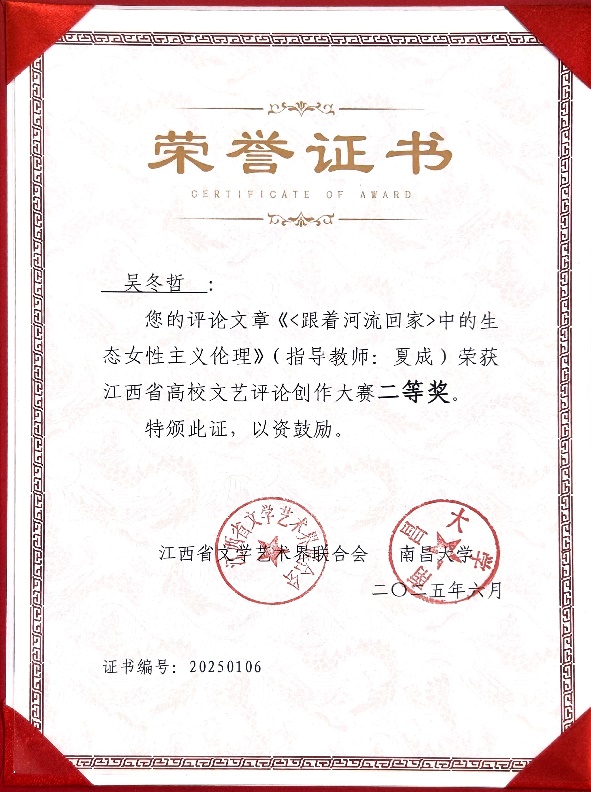 6月19日,江西省高校文艺评论创作大赛颁奖典礼在南昌大学举行。欧冠人文与公共管理学院中文系吴冬哲同学的论文《〈跟着河流回家〉中的生态女性主义伦理》(指导教师:夏成)荣获大赛二等奖。