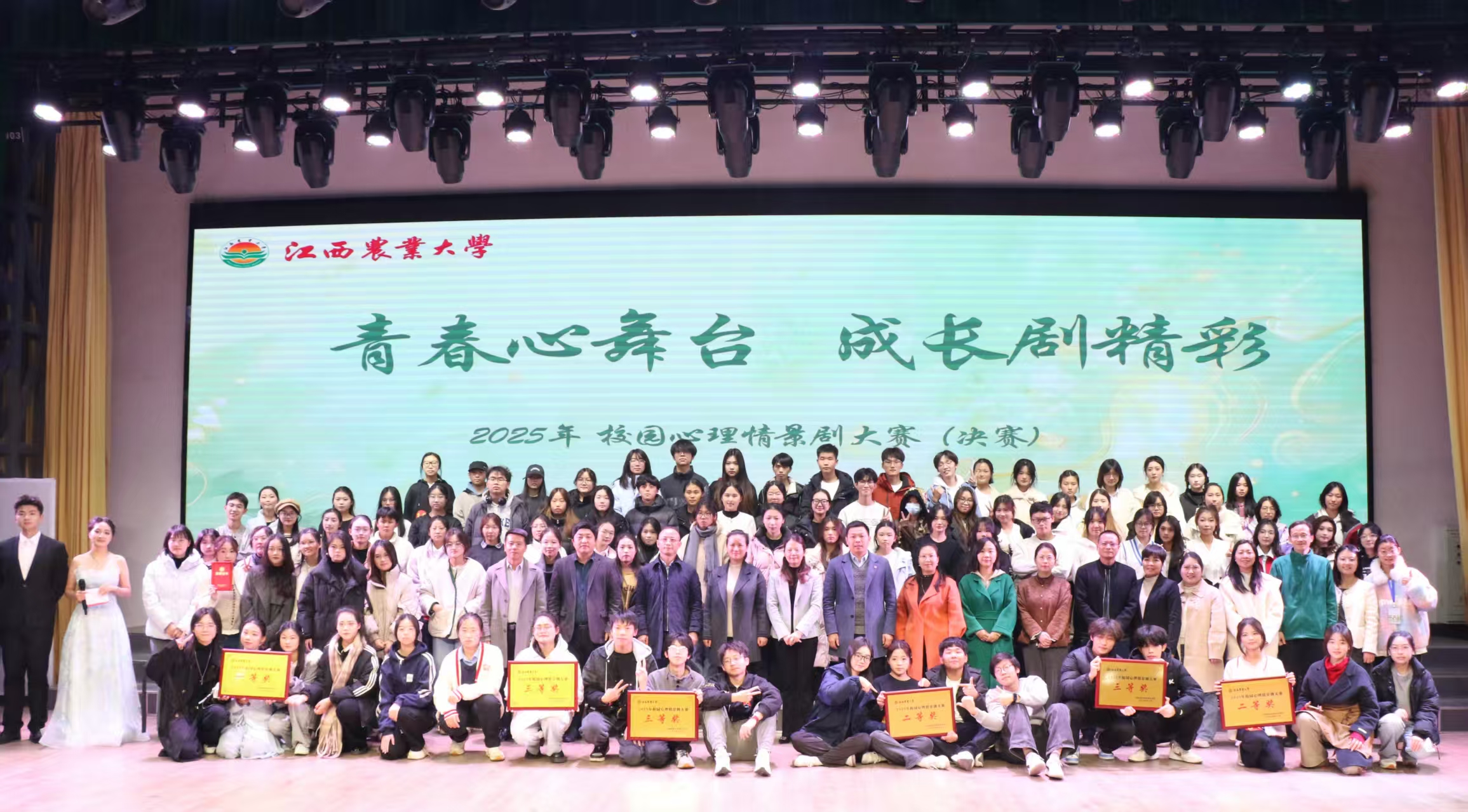 12月12日晚,欧冠大礼堂内座无虚席、气氛热烈,2025年校园心理情景剧大赛决赛在此精彩上演。来自江西师范大学、华东交通大学、江西中医药大学、江西科技师范大学等兄弟高校专家同仁及欧冠1000余名师生观看比赛。