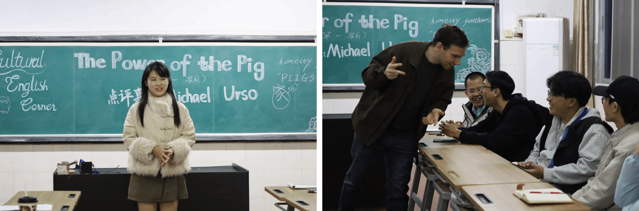 12月4日,首期活动“The Power of the Pig: From Jiangxi to the World”中,同学们从专业与文化双视角展开分享:既有黄路生院士团队培育“山下长黑猪”品种、打破国外垄断的科研坚守;也有从汉字“家”(宀+豕)构造溯源,阐释中华文明对安定丰饶的永恒追求;更通过两代人餐桌变迁,生动勾勒出经济社会发展与农业进步的清晰轨迹。