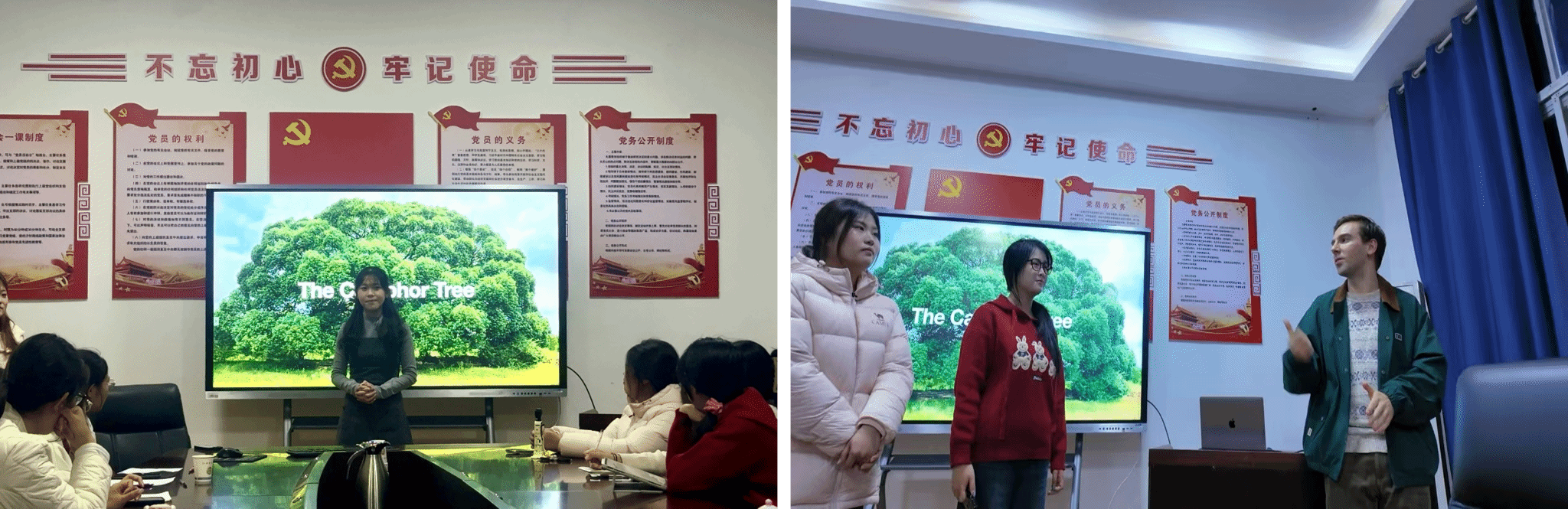12月11日,第二期“The Camphor Tree: A Green Legend from Jiangxi”聚焦江西文化名片。同学们讲述了江南“女儿香”千年习俗——女婴出生时种樟树,出嫁时伐木制箱作嫁妆的温情传统;揭秘江西依托300余处古樟群落,成为全国最大天然芳樟醇生产基地的“绿色密码”。