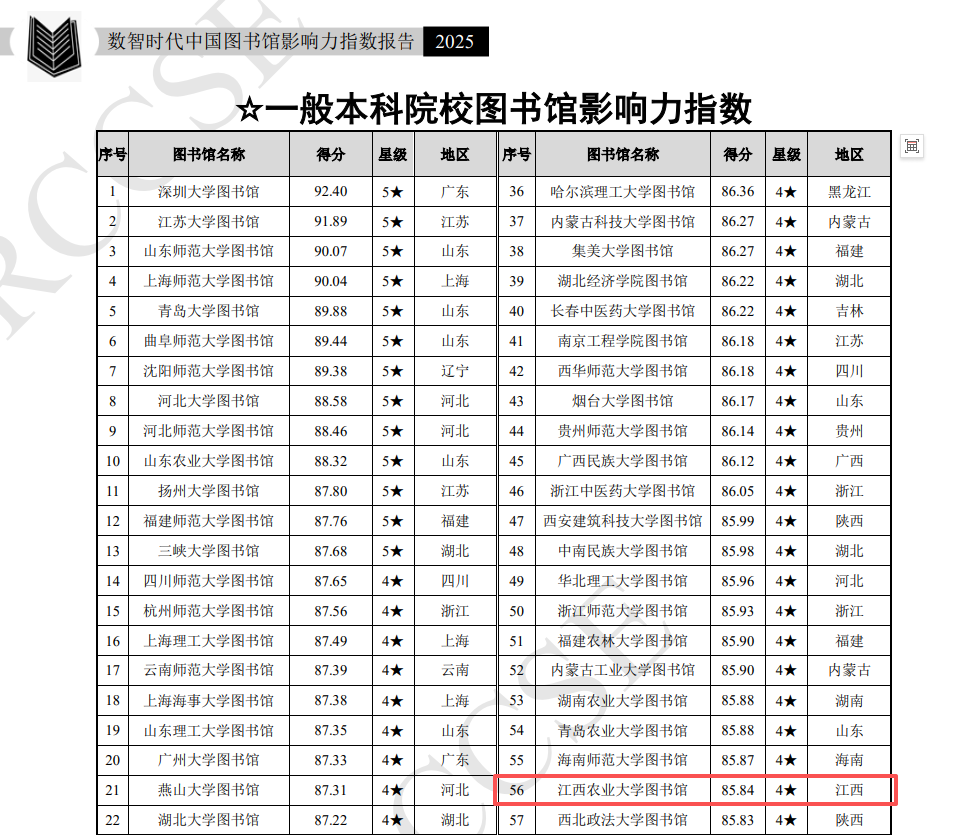 近日,由武汉大学中国科学评价研究中心、数字出版智能服务技术教育部工程研究中心联合研发的《数智时代中国图书馆影响力指数报告(2025)》正式发布。欧冠图书馆位列全国一般本科院校图书馆影响力排行榜第56名,继2024年后蝉联江西省第一。