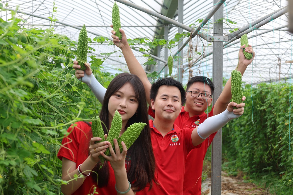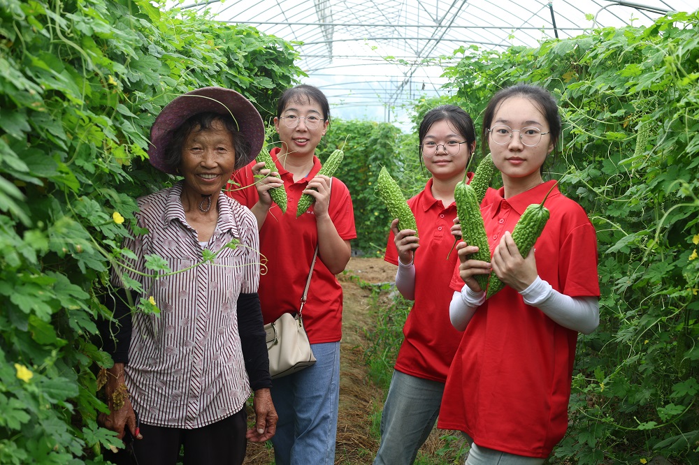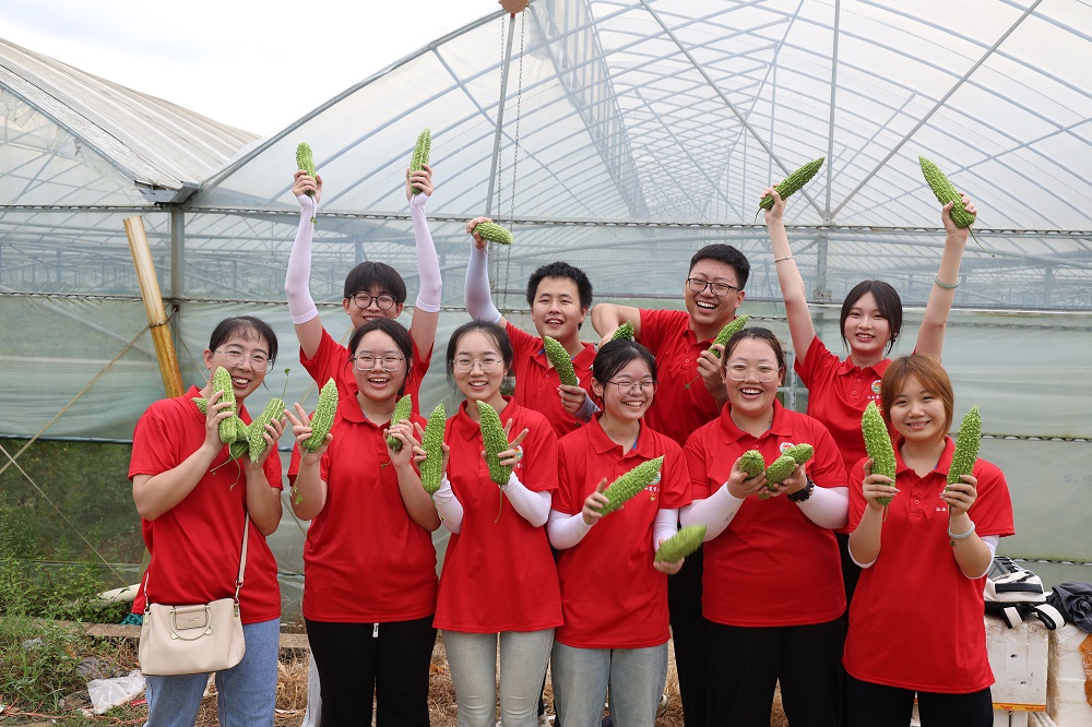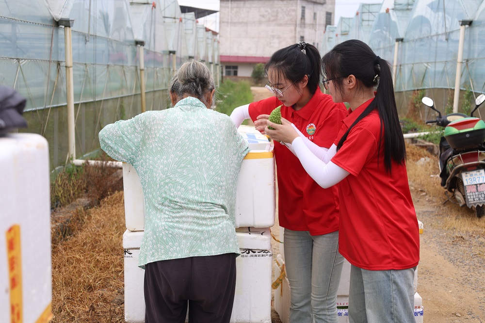 志愿者们深入苦瓜种植大棚,看着藤蔓上的一个个长势喜人的苦瓜,卢阿姨欣喜地说:“种苦瓜虽然辛苦,但是种出来的瓜质量好,有销路,天天都有收成,我觉得很开心,也不觉得辛苦了!”别看这小小的“苦瓜”它不起眼,却是农户致富法宝。采摘、分拣、打包、装箱,碧翠的瓜离开滋育的藤,苦瓜变成“甜瓜”,托起了农民们的致富梦,志愿者们用耕劳与汗水浇灌青春之花,唱响杨梅村乡村振兴主旋律。在这片热土上,体验三农、服务三农,用实际行动为中国式现代化建设贡献自己的力量。