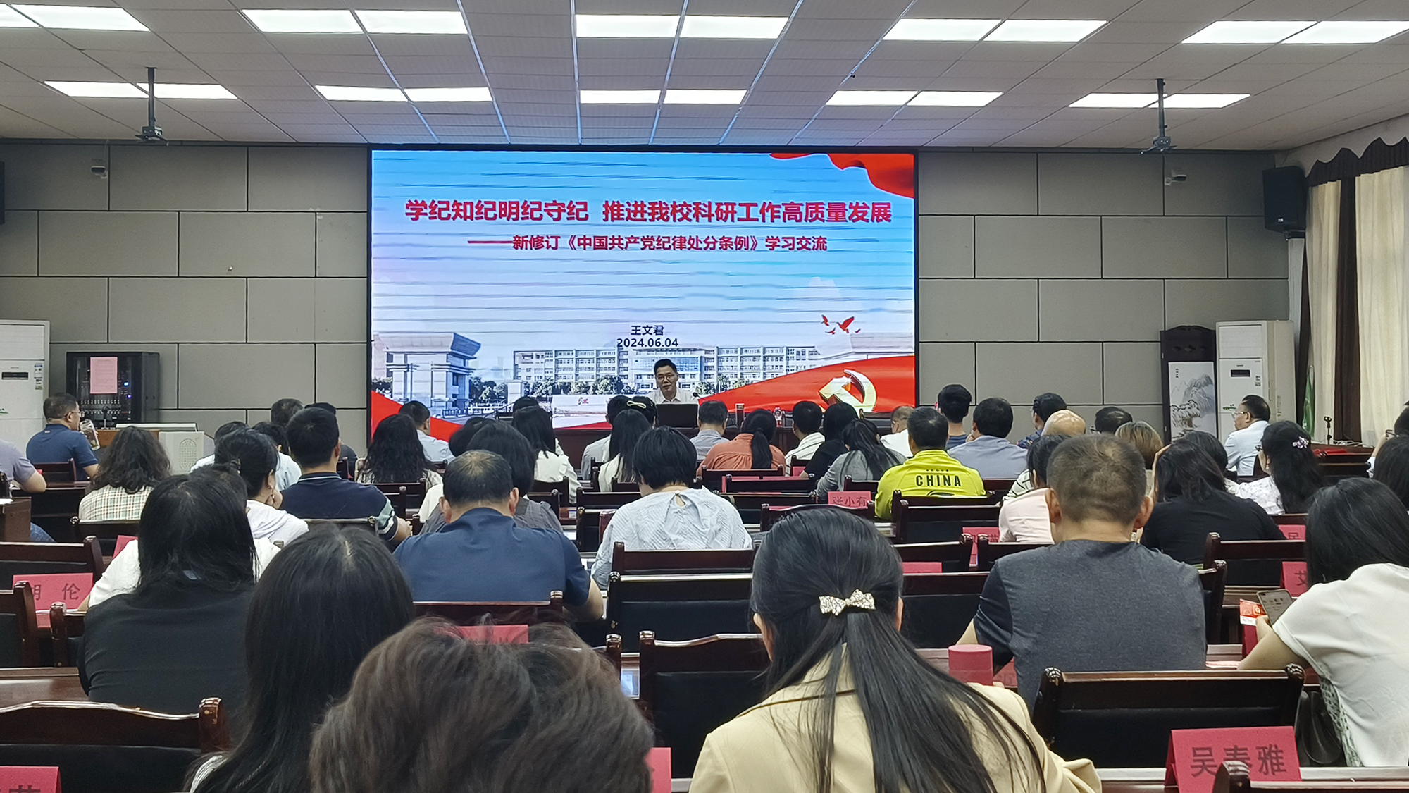 王文君围绕党纪学习教育,从深刻认识修订《条例》的重要意义、准确把握《条例》修订的主要内容、高度重视《条例》修订后与我们的日常工作和生活紧密相联的内容三个部分开展党课讲授,以学校科研工作为切入点,带领学院教工党员共同学习了在科研工作中容易出现的违纪现象,引导广大教工党员加强自我约束、提高免疫能力,明白能干什么、不能干什么,以党纪学习教育推进学校科研工作高质量发展。