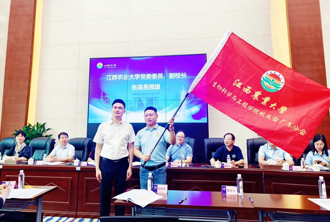 张高亮为生物科学与工程学院校友会广东分会授旗,当选会长罗静代表广东分会接旗。出席大会领导为新当选的学院校友会广东分会第一届理事会成员颁发聘书。广东分会首届会长罗静作表态发言。
