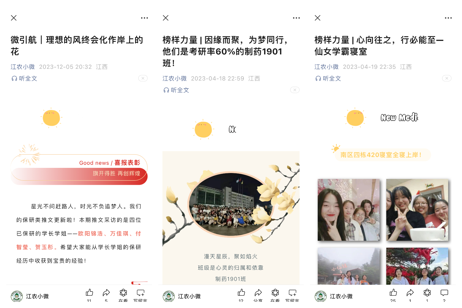 加强宣传,营造以考促学氛围。学院依托“江农小微”微信公众号,整理发布考研相关咨询,为学生提供信息获取渠道。打造“微榜样”专栏,定期推送优秀学长学姐考研经验分享,营造浓厚的考研氛围。