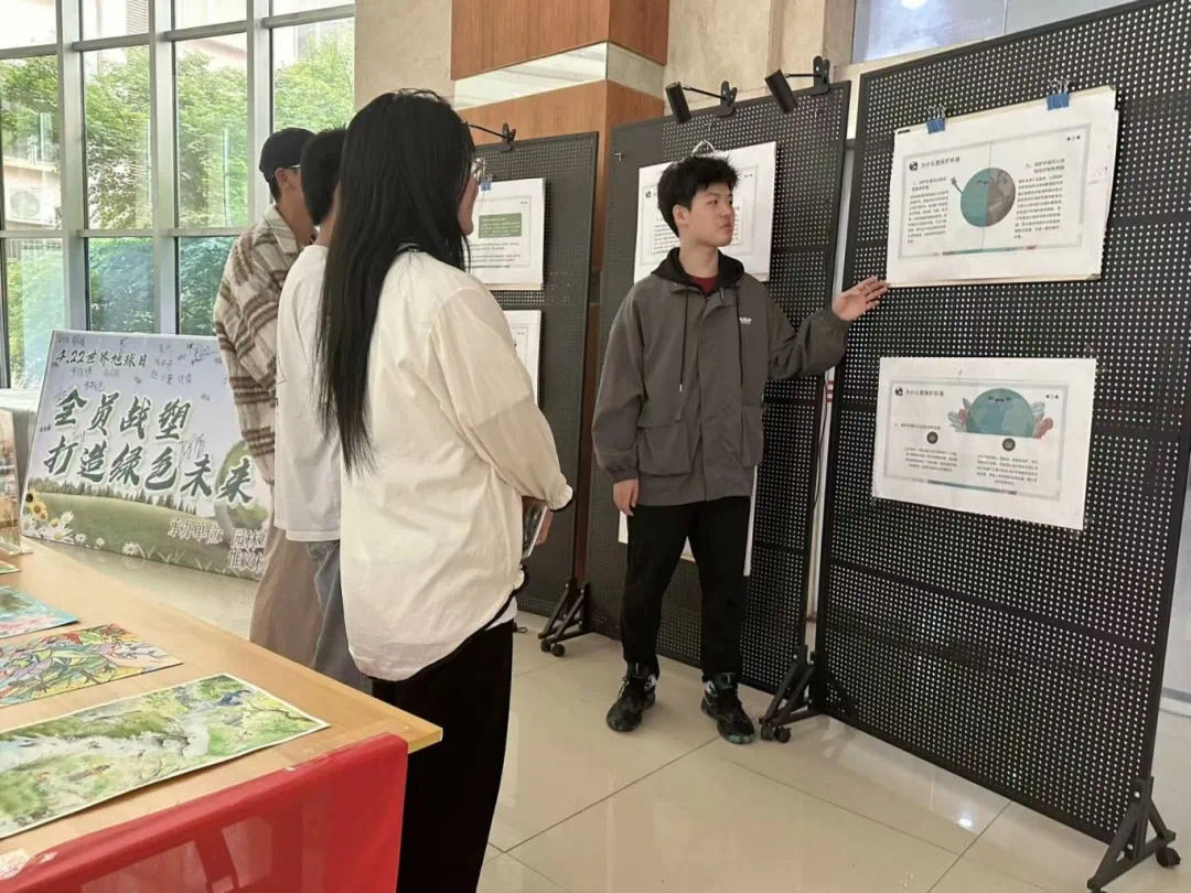 当天上午,在大学生活动中心广场,学院开展以“邀山河共舞,与地球对画”为主题的手绘展活动。同学们通过油画、水彩画、水墨画、板绘、工笔画、自然物拼贴画等手工画作,以艺术之名为地球发声。一幅幅画作展现了地球之美,诉说生态环保问题,同学们向到场的师生介绍了画作的创作思想,分享了创作的灵感与心得,通过现场互动交流,提高大家生态环保意识,呼吁大家保护环境,守护家园。