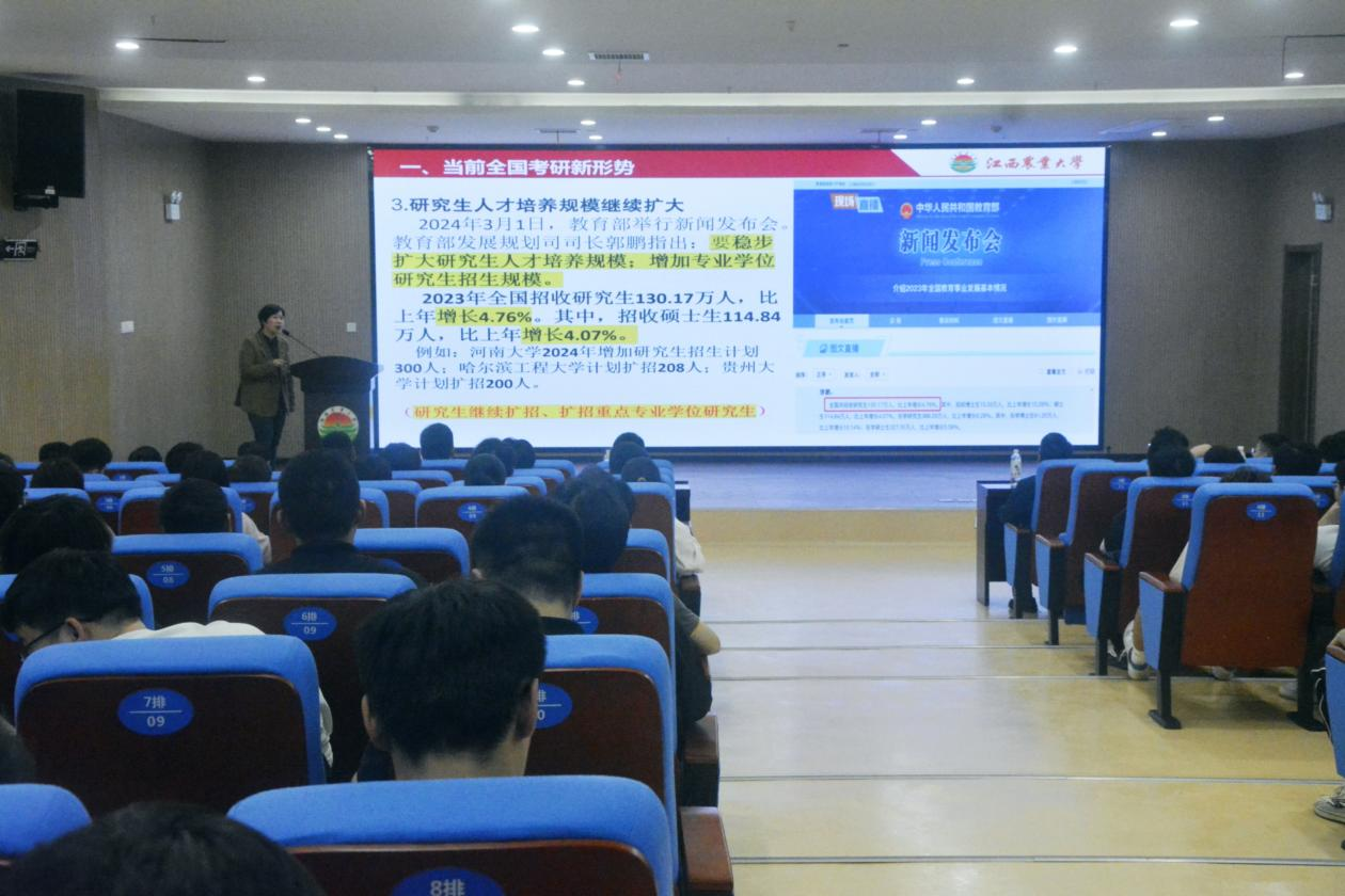 会上,校招就处副处长李莉萍作《考研升学形势分析报告》,围绕“当前全国考研新形势”“学校考研升学总体情况”“学生考研备考对策建议”三个方面,全面系统地解读了当前的考研形势。优秀校友、学院2014届毕业生、南昌海关技术中心张烈远,结合毕业多年后重新考研的经历,介绍了考研深造的作用和价值。学院邀请一对学霸兄妹——学校国家重点实验室研究生、学院2022届毕业生王名杨和学院2020级学生、拟录取中国农业大学的考研学生王宇珍作经验分享,两人结合读研和备考经历,告诉全体在座同学“为什么要考研”“怎么样考研”“读研的意义”。材料与化工系主任刘倩作报考本校考研动员,从多个方面展示了学校和学院的优势特色和育人成效,鼓励同学们报考江农、筑梦江农。