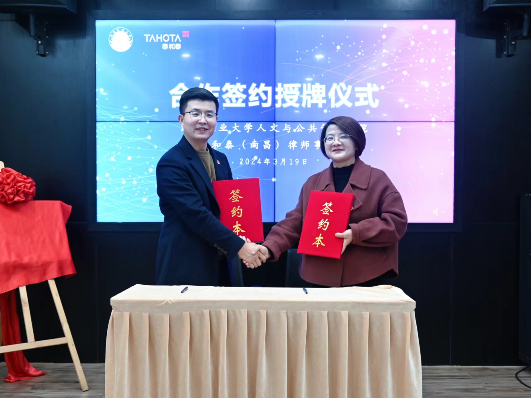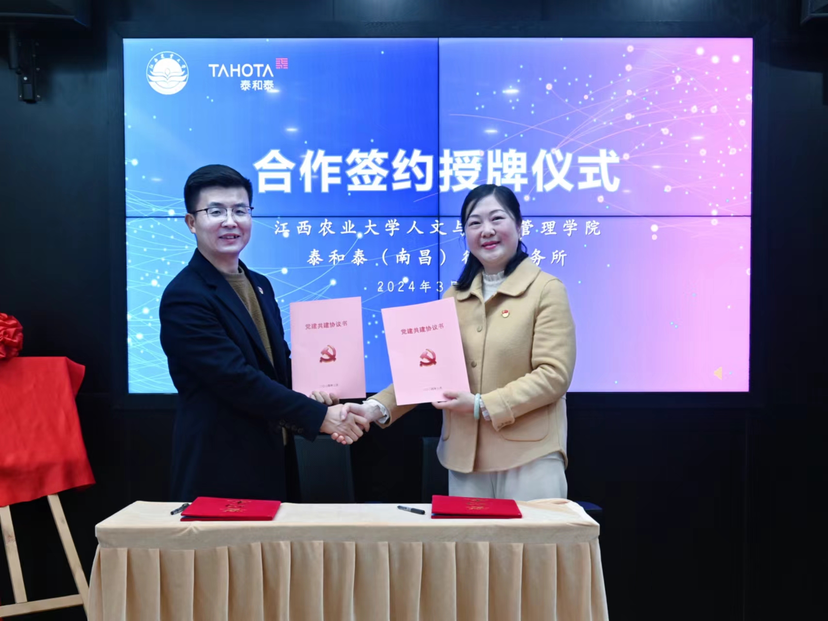 为深入学习贯彻党的二十大精神,进一步发挥党建引领作用,构建校企协同育人新格局,扎实推进乡村振兴战略的有效实施,3月19日,人文与公共管理学院与泰和泰(南昌)律师事务所党建结对共建暨“乡村振兴基层治理法律服务实践基地”签约暨揭牌仪式顺利举行。