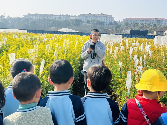 活动邀请了农学院付东辉教授团队进行授课,通过生动的讲解和图片展示,向孩子们介绍了七彩油菜花的生长过程、花瓣结构以及现有颜色品种等方面的知识。随后,孩子们在老师的带领下,来到油菜花田进行实践探索。一进入试验田,绚丽的色彩冲击着孩子们的视觉,孩子们兴奋地奔跑着,用稚嫩的小手触摸着春天的花朵和嫩叶,感受着大自然的神奇和美丽。他们利用多种感官,从花的颜色、形状、气味感受油菜花的特点。他们一边欣赏着春天油菜花的美景,一边与伙伴讨论着自己的观察发现:油菜花有哪些颜色、油菜花是什么味道、为什么有蜜蜂等等。