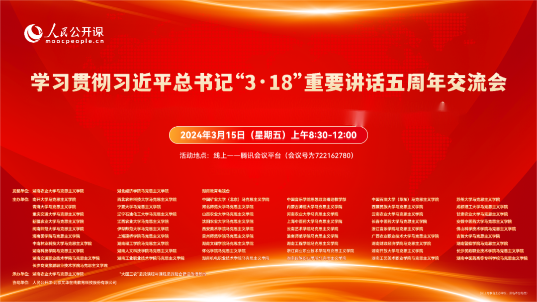 在习近平总书记“3•18”重要讲话五周年到来之际,为深入贯彻习近平总书记关于思政课建设的重要论述,3月15日上午,欧冠马克思主义学院协同全国58所高校马克思主义学院,共同推出学习贯彻习近平总书记“3•18”重要讲话五周年线上交流会。全国58所高校马克思主义学院协同参与交流会。活动以“线上+线下”联通、“主会场+分会场”联同、“思政+三农+艺术”虚拟教研室联建的方式展开,活动主会场设在湖南农业大学马克思主义学院,各地各校马克思主义学院设分会场,湖南农业大学马克思主义学院院长胡艺华教授主持。