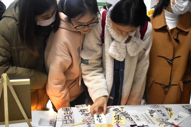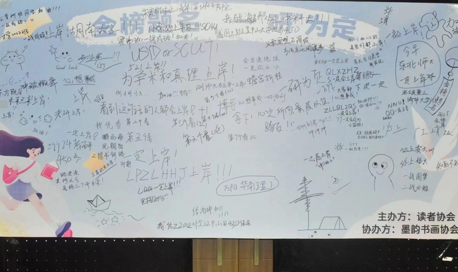 活动共吸引近200名学子参与,由读者协会精心准备的糖果小零食、便签本、暖宝宝、贴纸笔等考研上岸礼包全部送达考研学子的手中,墨韵书画协会准备的一份份书写有“平安喜乐、未来可期、天道酬勤”等字样的精美书签也深受大家的喜爱。期间,“牛牛”的出现更是为这冬日增添了一抹暖色!最后,考研学子们拿起手中的笔,在留言板上写下“一定上岸、未来已来、XXX必上XXX学校”等心愿,或者是写下对考研学长学姐们的期语与祝福语。
