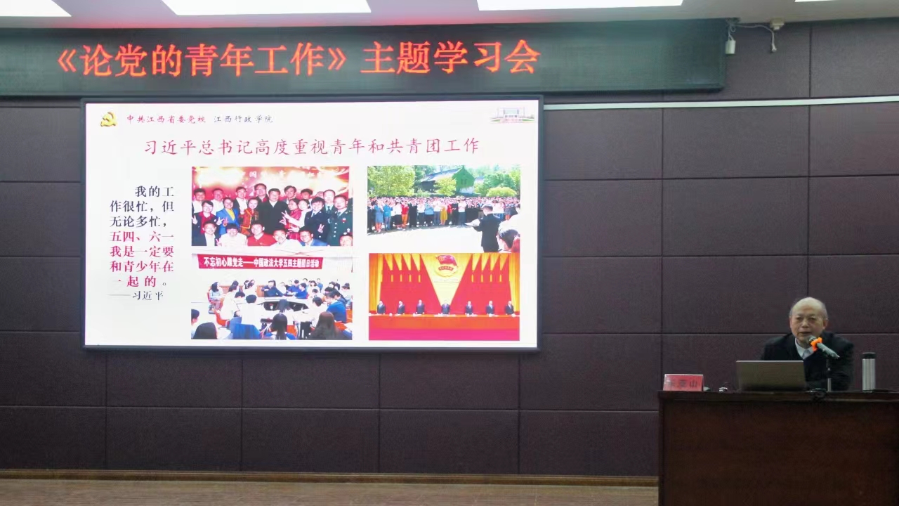 在授课环节上,江西省委党校群团理论教研部负责人、江西省团校副校长乐亚山教授以“论党的青年工作”为主题,从“全党要把青年工作作为战略性工作来做”“着力培养担当民族复兴重任的时代新人”“以政治建设为统领全面加强团的建设”等三个方面,向学员们阐释了学习习近平总书记关于青年工作的重要思想的深刻内涵,并号召全体学员做新时代坚定的青年马克思主义信仰者、研究者、传播者和践行者,以时代新人的姿态做社会主义合格建设者和可靠接班人。
