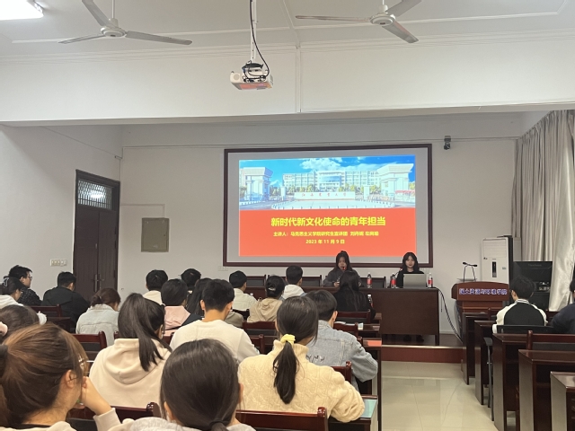 为深入学习贯彻习近平文化思想,进一步坚定文化自信,11月9日晚,马克思主义学院习近平新时代中国特色社会主义思想研究生宣讲团应邀赴国土资源与环境学院开展宣讲。宣讲团成员刘丹妮、左尚瑜以《新时代新的文化使命的青年担当》为题作宣讲。国土资源与环境学院学生干部90余人在现场听讲。