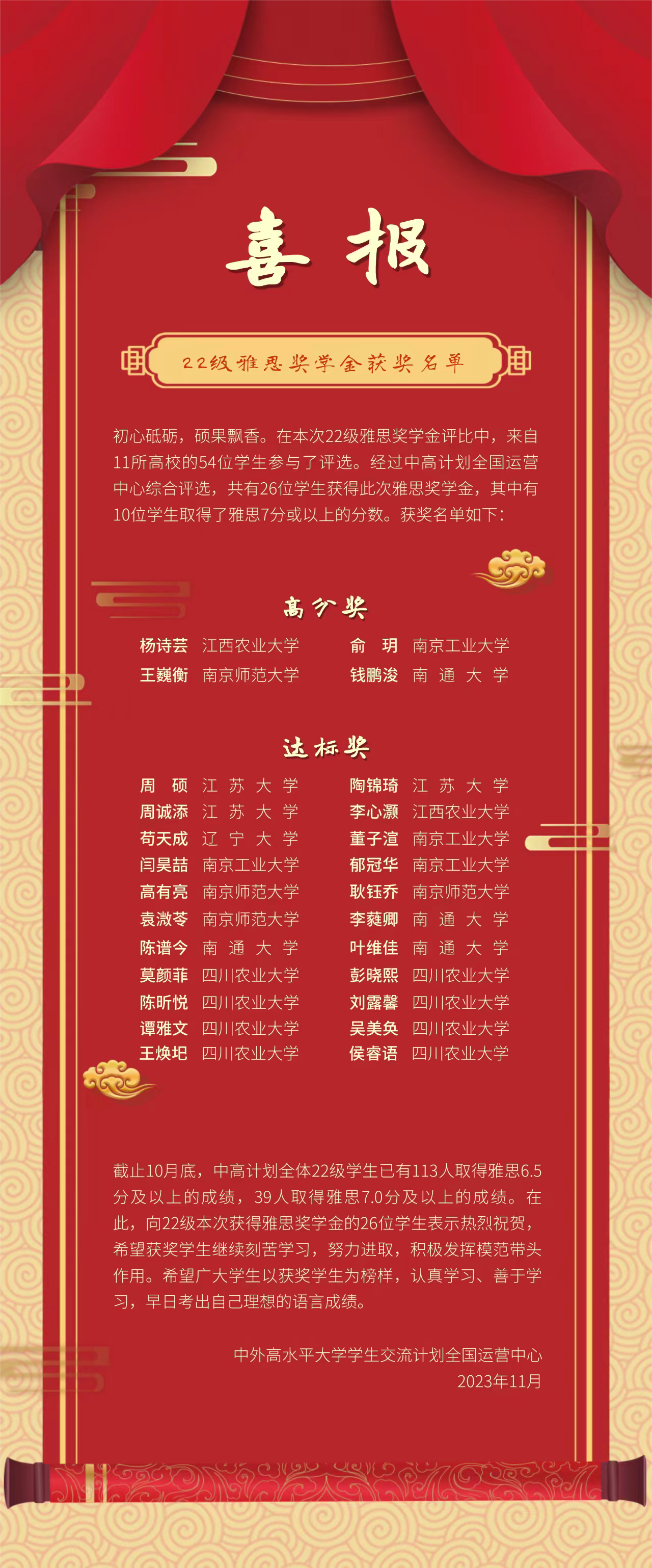 此外,22级环境科学与工程班杨诗芸同学获得22级雅思奖学金高分奖,22级会计学班李心灏获得22级雅思奖学金达标奖。