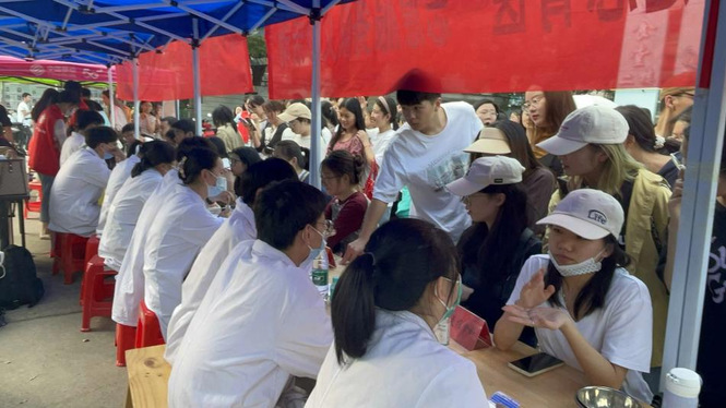 义诊现场,义诊志愿者围绕内科、外科、五官科、妇科、骨伤科等中医科目,开展测血压、测血糖、把脉、问诊、针灸、推拿、养生操等项目。前来参加义诊的研究生络绎不绝,纷纷将生活中遇到的健康困惑向义诊团队寻求解答。