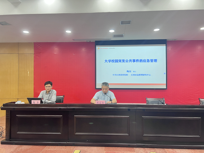 为提升全校平安建设能力水平,11月1日下午,学校邀请江西省委党校领导力拓展教研部副教授、江西省应急管理研究中心陶东博士,作题为《大学校园安全突发公共事件的应急管理》主体讲座,各单位党政主要负责人、平安建设分管领导和平安建设专职联络员,各学院党委副书记和辅导员聆听讲座。